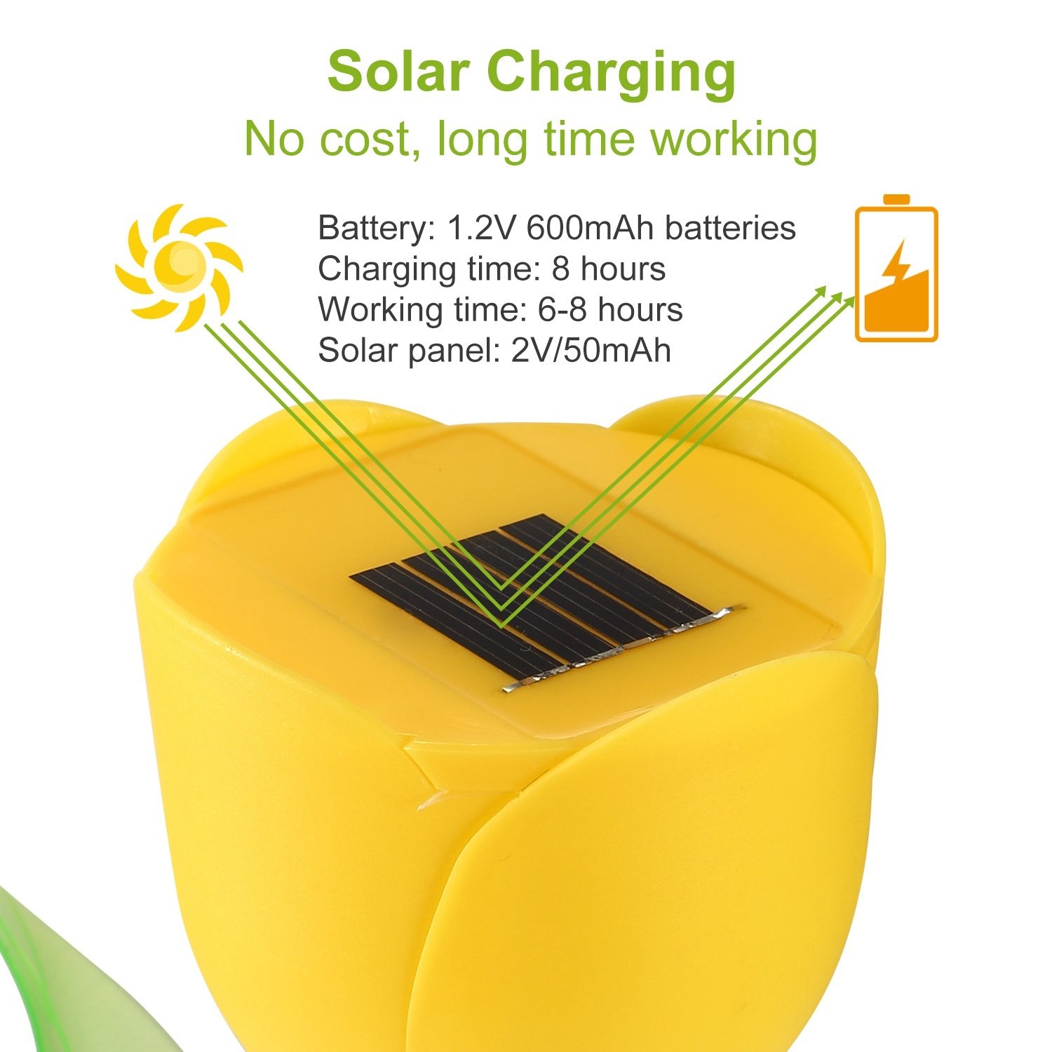 *SOLAR POWERED*:Our solar garden tulip flower lights are solar powered. Simply absorb solar energy to charge for about 8 hours,and illuminate for 6-8 hours during night. Note:Choose an outdoor location with full direct sunlight where the Solar panel can receive at least 6 hours of sunlight each day.