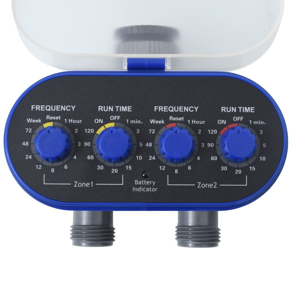 This garden automatic water timer, featuring an automatic watering system, is designed to save water and time. It contains two sets of watering buttons, allowing you to water two garden sectors at the same time. Each can be easily set up with two dial wheels: One for cycle time and the other for watering time. Made of ABS, this water timer is waterproof. Thus, it ensures a long service life.