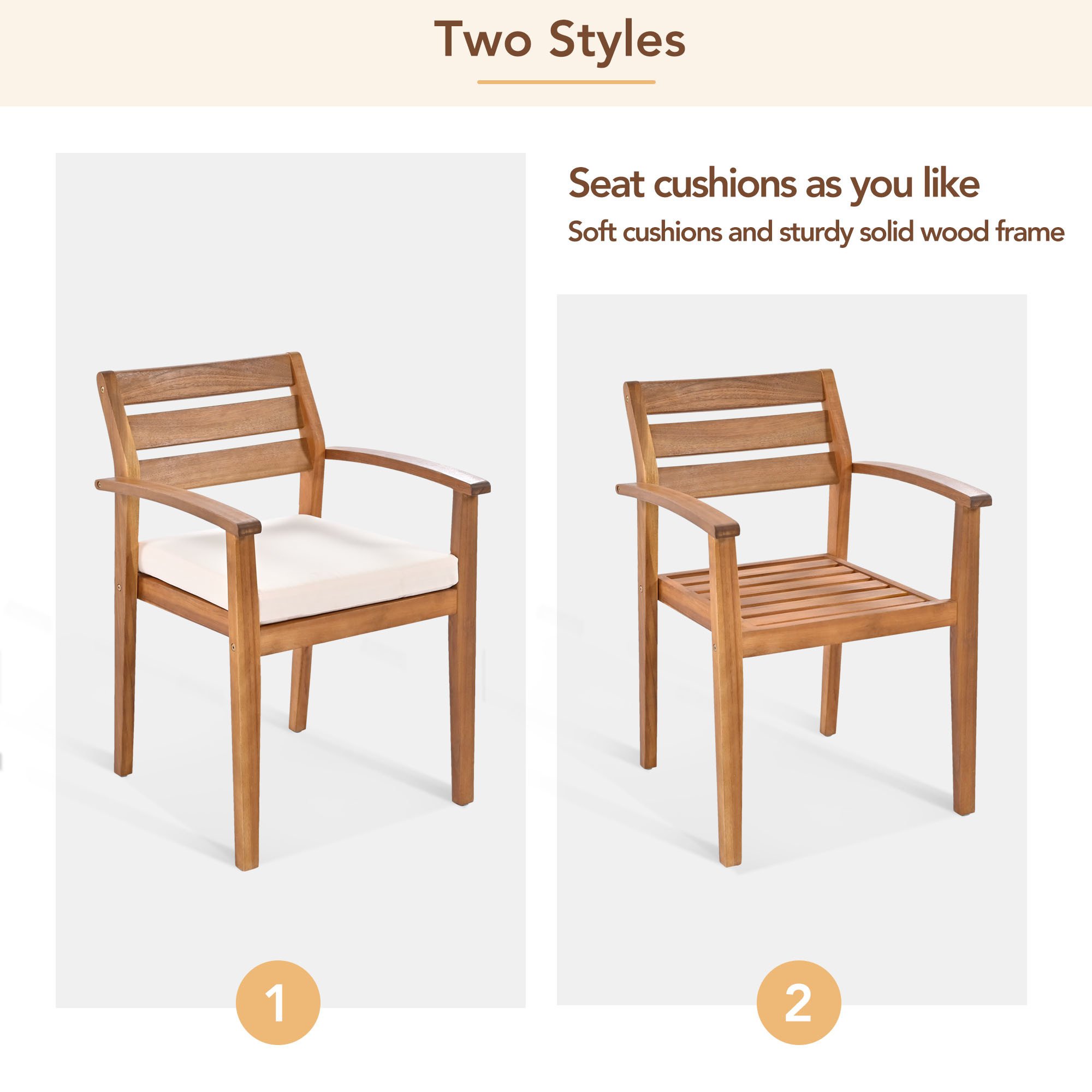 With Cushions: The chairs in the set are made of 100% acacia wood, ensuring the chair is stable and strong for any size person sitting. Equipped with removable cushions, which add additional comfy and can be easily washed.