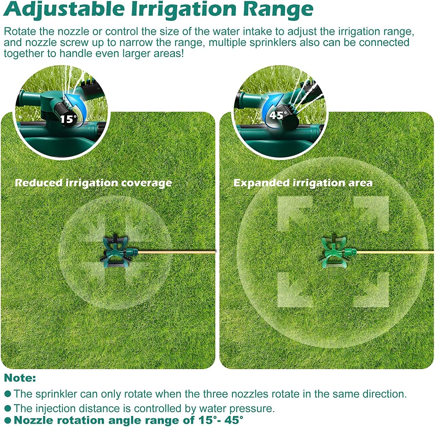 [ Water Every Corner Of Your Garden ] This grass sprinkler features 3 adjustable rotating arms and 12 built-in different angle spray nozzles that let you control the watering range to cover every corner of your garden.