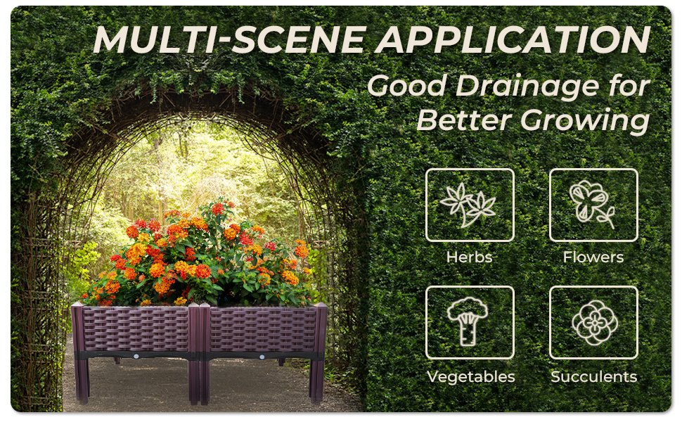 [Wide Applications]- This plastic raised garden bed planter is perfect for planting in the balcony, terrace, garden, backyard, patios, or the corners in your living room. It enables you to grow flowers, vegetables, fruits, and herbs practically anywhere.