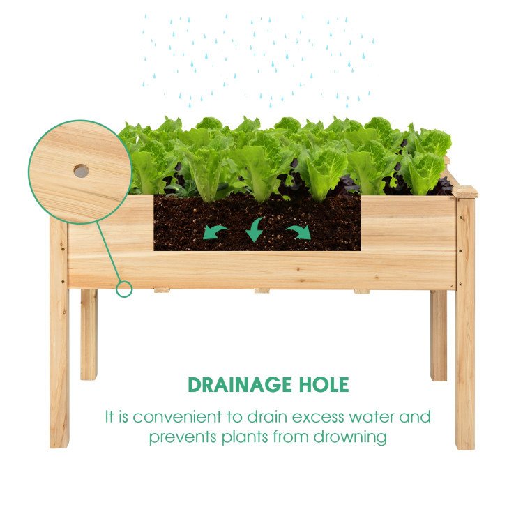This raised garden bed measures 49.5" x 23.5"x 30" (L x W x H) and loads up to 220 lbs; which allows you to cultivate multiple favorite plants while making your garden clean and tidy. Made of natural fir wood with exquisite craftsmanship; the elevated planter box is waterproof; durable; and resistant to warp or split; ensuring long-lasting durability. The thickened boards and strong legs provide strong support preventing wobbling or tippling over. In addition; there exist 4 drainage holes on the bottom allowing excess water to drain in time to keep the soil fresh and prevent your plants from over-watering. More than that; the 30'' height design prevents painful bending or kneeling to preserve your back and knees. this planter box is simple but quite practical for planting various vegetables; flowers; herbs; and fruit. (Note: You can add liners to protect the garden bed from water damage (not included)).