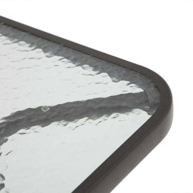 2.Includes 4 foldable, portable, easy-to-store armchairs, a square table with a water-wave, tempered glass top, and a stylish market umbrella