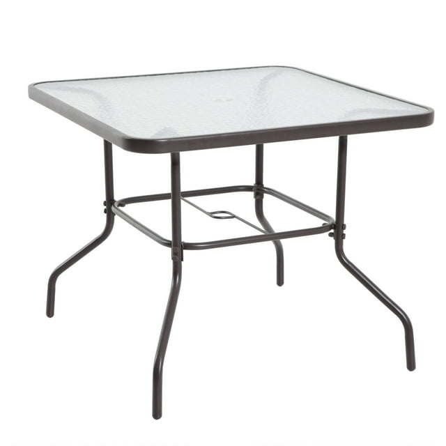 Entertain friends, family, and neighbors with tasty treats and witty conversation in casual style on your patio, porch, or deck with the 6-Piece Outdoor Patio Dining Set, Black. Ideal for dining and relaxing, this casual patio dining set includes 4 foldable, portable armchairs, a square table with a water-wave, tempered glass top and a 2" umbrella hole, and a stylish market umbrella for shade and protection from the elements, as well as instructions for easy assembly. The chairs and umbrella feature black, ventilated, quick-drying sling fabric, and the sturdy, black frames of all 6 pieces are constructed of powder-coated, rust-and-corrosion-resistant steel for durability and longevity. The classic look of the all-season set complements most other outdoor furniture and decor. Add a quaint, fun little addition with traditional style and quality craftsmanship to your porch, patio, or deck with the 6-Piece Outdoor Patio Dining Set.